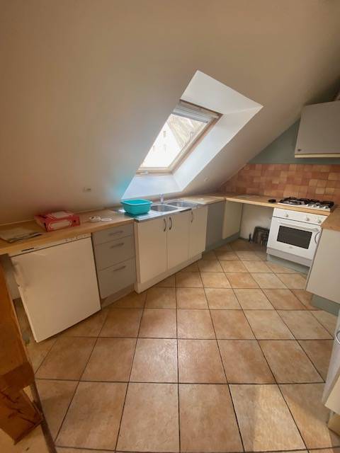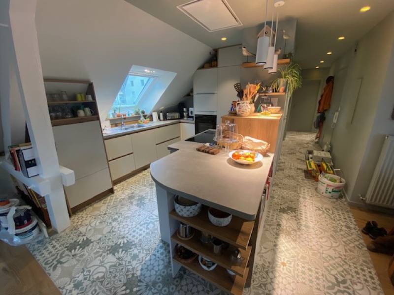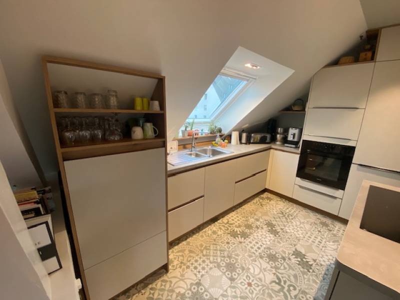 Avant : L'espace était sous-exploité, avec une cuisine inadaptée à la pente du toit. Les mètres carrés sous les rampants étaient perdus, le manque de rangements efficaces était criant et le faible éclairage rendait la pièce sombre. L'agencement manquait de fluidité, ne tirant pas parti de l'architecture unique de l'appartement.