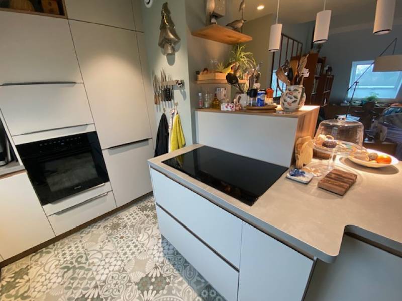 Qualité et Durabilité : L'installation est faite avec des matériaux haut de gamme, comme un plan de travail en céramique ou en granit, assurant la durabilité et la facilité d'entretien de cette cuisine de qualité allemande.